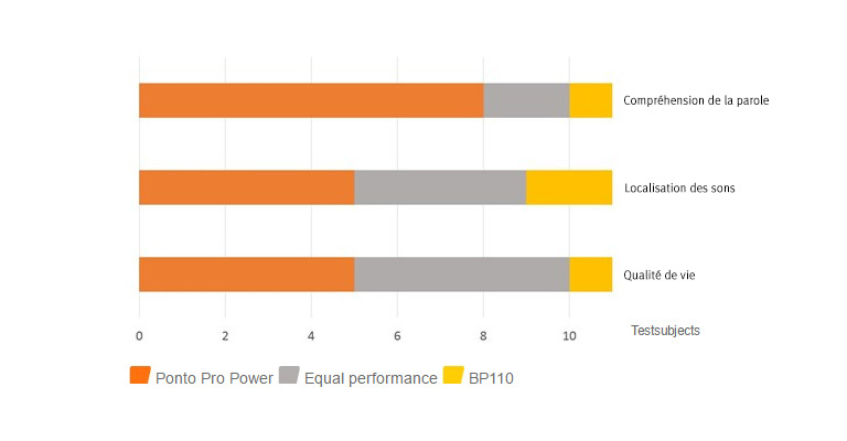 Les sujets du test ont également indiqué que le Ponto Pro Power est plus confortable à porter en extérieur par rapport au BP110. D'ailleurs, 9 sujets testés sur 11 ont sélectionné le Ponto Pro Power comme étant leur dispositif préféré.